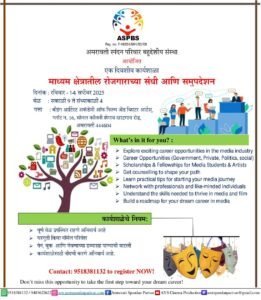 या कार्यशाळेत माध्यम क्षेत्रातील विविध संधींवर सखोल मार्गदर्शन केले जाणार आहे. केवळ मनोरंजनापुरते मर्यादित न राहता रोजगार, व्यवसाय आणि उद्योजकतेसाठी हे क्षेत्र कसे उपयुक्त आहे, यावर विशेष भर दिला जाईल. यात फिल्म, नाटक, वेब सिरीज, न्यूज चॅनल्स, सोशल मीडिया यांसारख्या क्षेत्रांमधील शासकीय, खाजगी, सामाजिक आणि राजकीय नोकरीच्या संधींवर चर्चा केली जाईल.