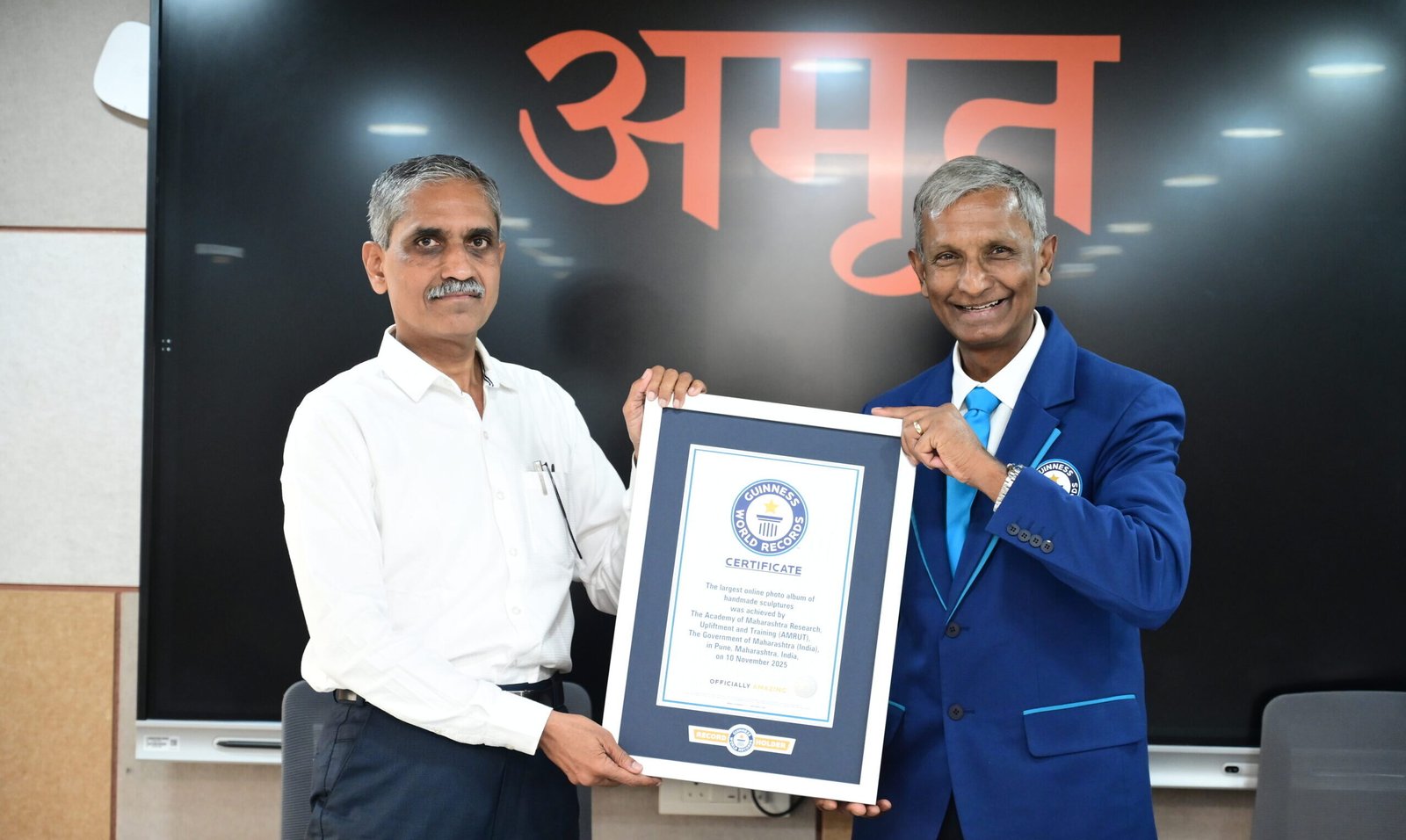 शिवप्रताप दिनाचे औचित्य साधून दिनांक १० नोव्हेंबर २०२५ रोजी अमृतच्या पुणे येथील मुख्यालयात विश्वविक्रमाचे अधिकृत प्रमाणपत्र प्रदान करण्यात आले. गिनीज वर्ल्ड रेकॉर्डचे प्रतिनिधी प्रवीण पटेल यांच्या हस्ते अमृतचे व्यवस्थापकीय संचालक विजय जोशी यांनी हे प्रमाणपत्र स्वीकारले.