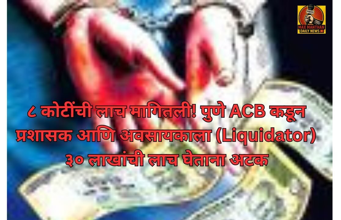 पुणे लाचलुचपत प्रतिबंधक विभागाने (ACB) एका शासकीय नियुक्त अवसायक (Liquidator) आणि प्रशासकाला ८ कोटी रुपयांची लाच मागितल्याप्रकरणी आणि अग्रिम (Advance) म्हणून ३० लाख रुपये स्वीकारताना शुक्रवारी (दि. ५ डिसेंबर २०२५) अटक केली आहे.