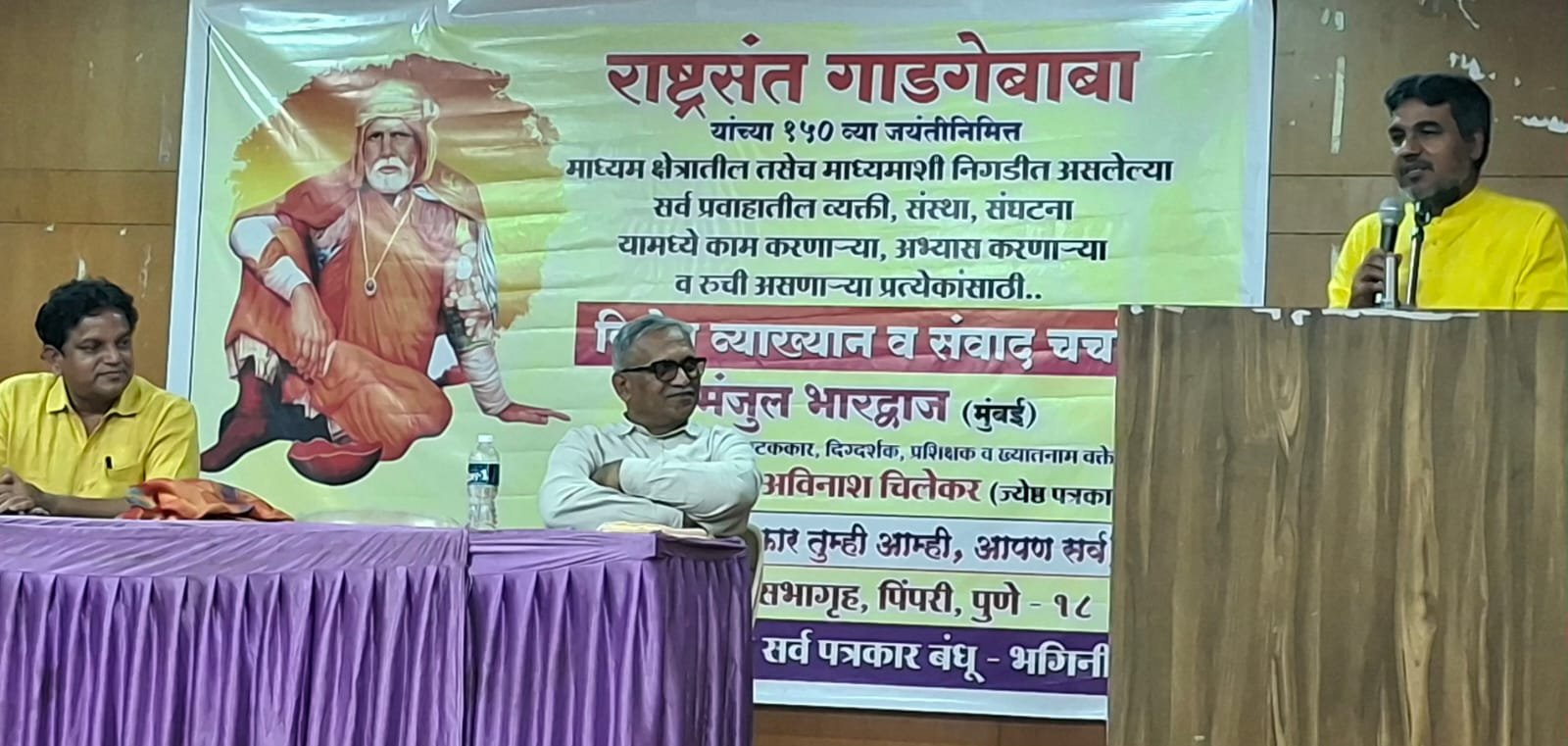 पिंपरी : “सत्य शोधणारा आणि त्या सत्यासाठी जगणारा माणूस म्हणजे पत्रकार होय. आजच्या काळात आपण गॅलिलिओसारखी स्पष्ट भूमिका मांडू शकतो का? हा प्रश्न प्रत्येक माध्यमकर्मीने स्वतःला विचारला पाहिजे,” असे परखड मत मुंबईचे ख्यातनाम अभिनेते, लेखक व दिग्दर्शक मंजुल भारद्वाज यांनी व्यक्त केले. राष्ट्रसंत गाडगेबाबा महाराज यांच्या १५० व्या जयंतीचे औचित्य साधून आयोजित ‘पत्रकार तुम्ही, आम्ही, आपण सर्व’ या विशेष व्याख्यानात ते बोलत होते.