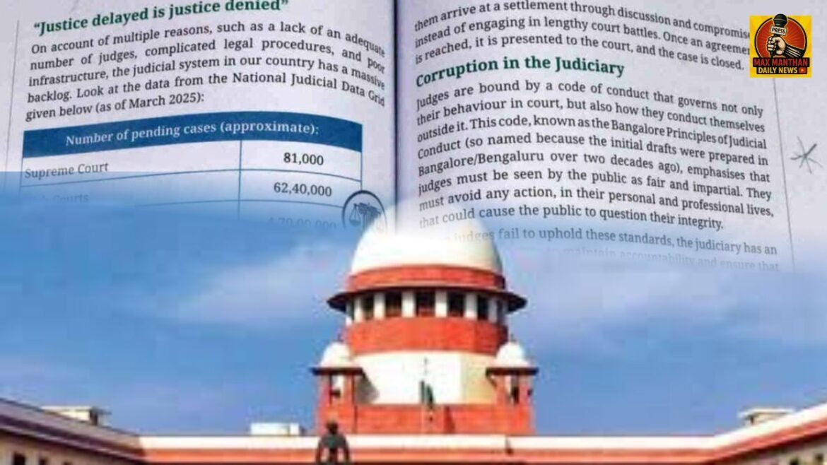 नवी दिल्ली : एनसीईआरटीच्या (NCERT) इयत्ता ८ वीच्या नवीन समाजशास्त्र (Social Science) पाठ्यपुस्तकात न्यायपालिकेतील भ्रष्टाचाराचा उल्लेख असलेले प्रकरण समाविष्ट केल्याबद्दल सर्वोच्च न्यायालयाने आज तीव्र संताप व्यक्त केला. या पुस्तकाच्या छपाईवर आणि डिजिटल वितरणावर तात्काळ ‘पूर्णपणे बंदी’ (Blanket Ban) घालण्याचे आदेश न्यायालयाने दिले आहेत. सरन्यायाधीश सूर्यकांत यांच्या नेतृत्वाखालील तीन न्यायाधीशांच्या खंडपीठाने या प्रकरणाला “न्यायपालिकेविरुद्धचे खोलवर रचलेले कारस्थान” असे संबोधले आहे.