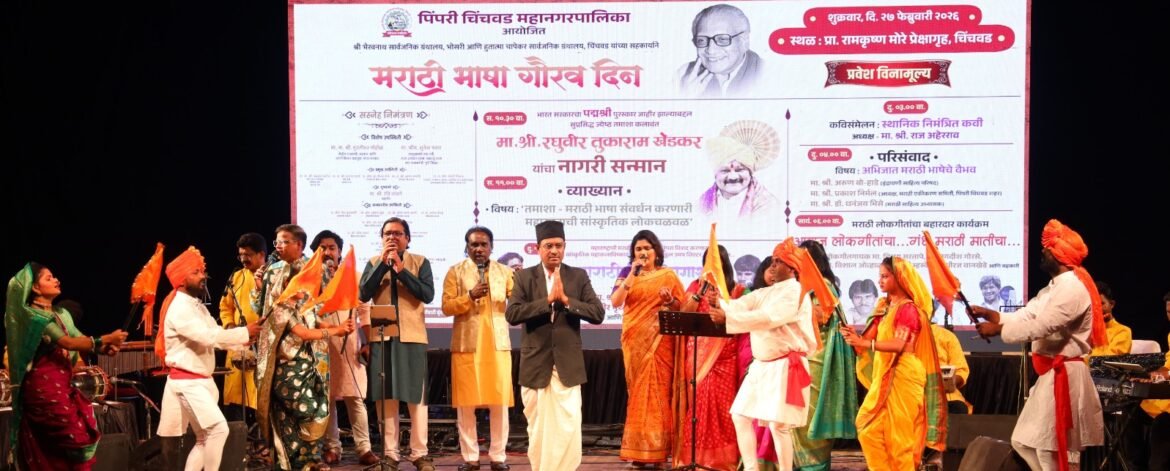 पिंपरी : खंजिरीचा कडकडाट, ढोलकीचा धडाका आणि शब्दाशब्दांतून ओसंडून वाहणारी मायमराठीची अस्मिता… अशा भारदस्त वातावरणात पिंपरी चिंचवड महानगरपालिकेच्या वतीने आयोजित ‘माय मराठीची गौरवगाथा’ हा सांस्कृतिक सोहळा रंगला. मराठी भाषा गौरव दिनाचे औचित्य साधून चिंचवड येथील प्रा. रामकृष्ण मोरे प्रेक्षागृहात लोककला, शाहिरी आणि सुश्राव्य संगीताचा सुरेल संगम रसिकांनी अनुभवला.