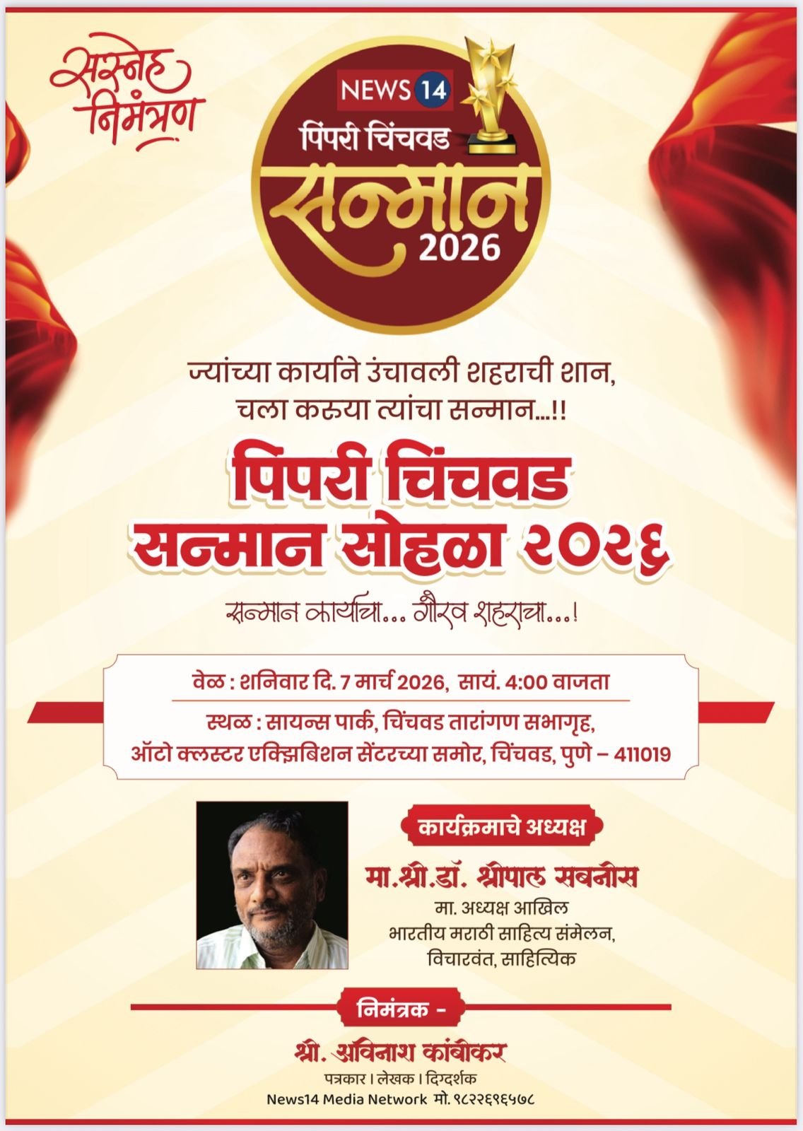 हा सोहळा शनिवार, दि. ७ मार्च २०२६ रोजी सायंकाळी ४ वाजता चिंचवड येथील सायन्स पार्क (तारांगण सभागृह) येथे पार पडणार असल्याची माहिती ‘News14 Media Network’ चे संपादक अविनाश कांबीकर यांनी दिली आहे. यंदाच्या निवड समितीने शहरातील खालील मान्यवरांची पुरस्कारासाठी निवड केली आहे: