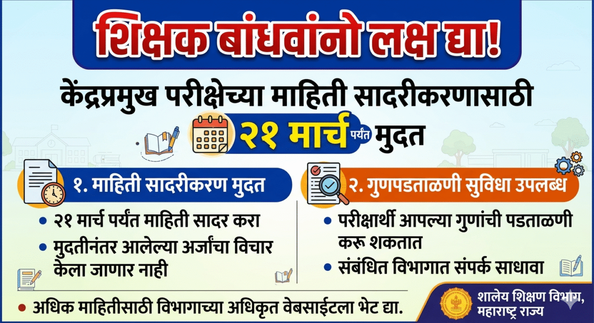 शिक्षक बांधवांनो लक्ष द्या! केंद्रप्रमुख परीक्षेच्या माहिती सादरीकरणासाठी २१ मार्चपर्यंत मुदत; गुणपडताळणीही उपलब्ध