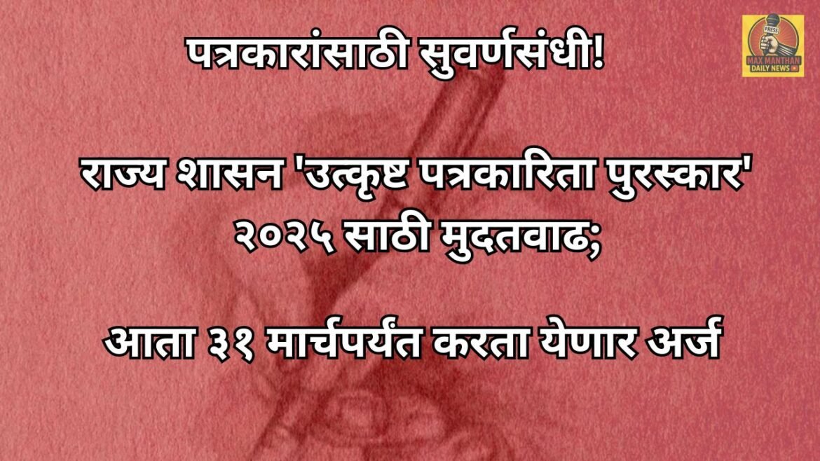 पत्रकारांसाठी सुवर्णसंधी! राज्य शासन ‘उत्कृष्ट पत्रकारिता पुरस्कार’ २०२५ साठी मुदतवाढ; आता ३१ मार्चपर्यंत करता येणार अर्ज