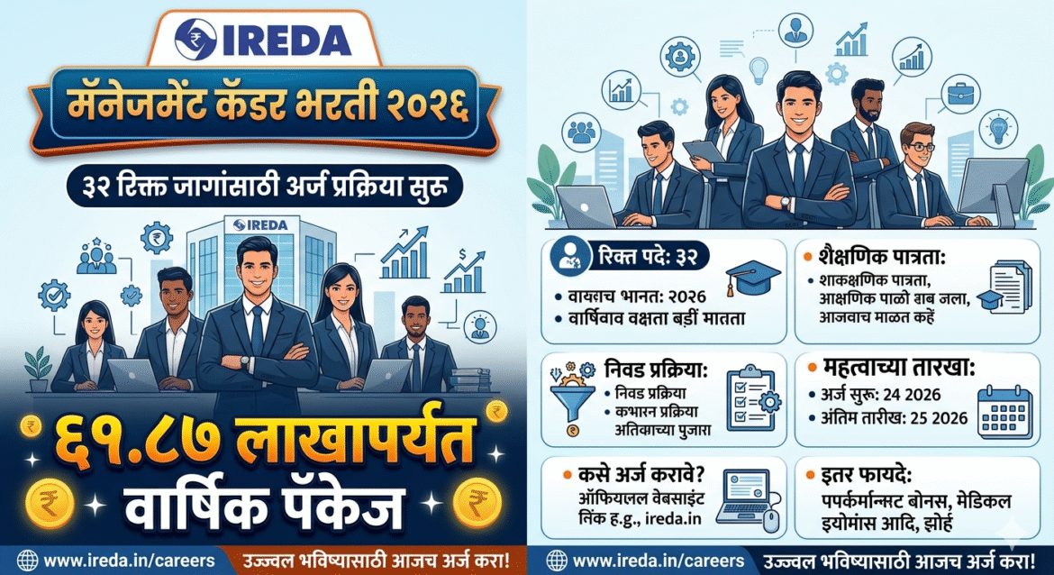 IREDA मॅनेजमेंट कॅडर भरती २०२६: ३२ रिक्त जागांसाठी अर्ज प्रक्रिया सुरू; ६१.८७ लाखांपर्यंत वार्षिक पॅकेज
