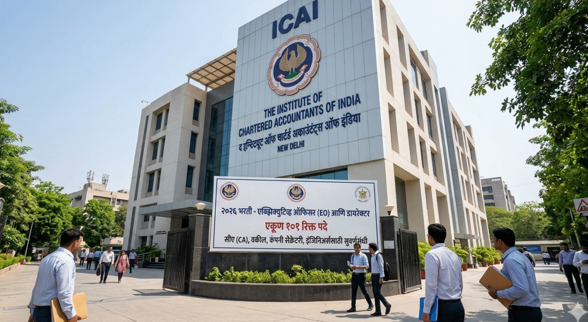 नवी दिल्ली: ‘द इन्स्टिट्यूट ऑफ चार्टर्ड अकाउंटंट्स ऑफ इंडिया’ (ICAI) या जागतिक स्तरावरील प्रतिष्ठित संस्थेने २०२६ साठी मोठी भरती जाहीर केली आहे. यामध्ये एक्झिक्युटिव्ह ऑफिसर (EO) आणि डायरेक्टर या स्तरावरील एकूण १०९ रिक्त पदांसाठी जाहिरात प्रसिद्ध करण्यात आली आहे. सीए (CA), वकील, कंपनी सेक्रेटरी आणि इंजिनिअर्ससाठी ही करिअरची मोठी संधी आहे.