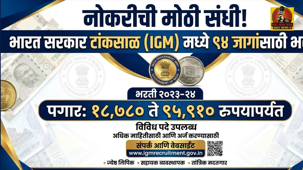 नोकरीची मोठी संधी! भारत सरकार टांकसाळ (IGM) मध्ये ९४ जागांसाठी भरती; १८,७८० ते ९५,९१० रुपयांपर्यंत मिळणार पगार