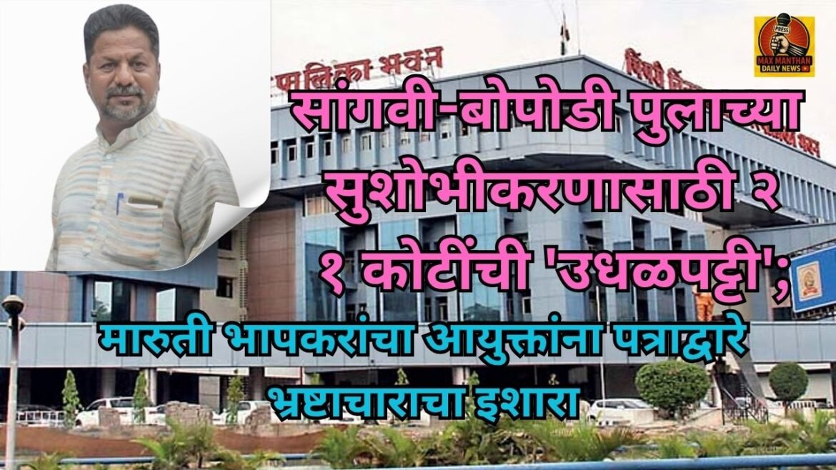 पिंपरी: पिंपरी-चिंचवड महानगरपालिका सध्या भ्रष्टाचाराच्या विळख्यात अडकली असून, त्याचे ताजे उदाहरण सांगवी-बोपोडी जोडणाऱ्या पुलाच्या सुशोभीकरण प्रकरणात समोर आले आहे. ३२ कोटींच्या मूळ पुलासाठी चक्क २१ कोटी ८७ लाख रुपये केवळ ‘सुशोभीकरणा’वर खर्च करण्यात आले आहेत. या अवाढव्य खर्चात मोठा गैरव्यवहार झाल्याचा आरोप सामाजिक कार्यकर्ते मारुती भापकर यांनी केला असून, त्यांनी आयुक्त डॉ. विजय सूर्यवंशी यांना पत्र लिहून या प्रकरणाची सखोल चौकशी करण्याची मागणी केली आहे.