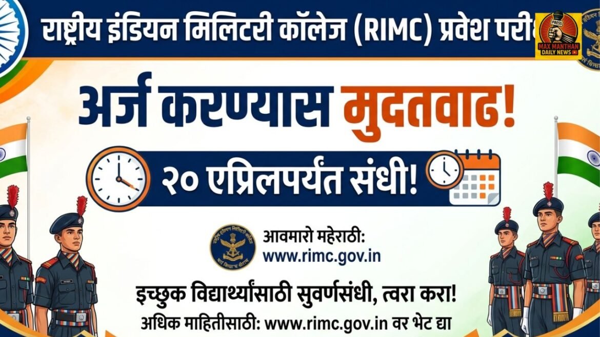 पिंपरी चिंचवड: डेहराडून येथील प्रतिष्ठित राष्ट्रीय इंडियन मिलिटरी कॉलेज (RIMC) मधील प्रवेशासाठी घेतल्या जाणाऱ्या पात्रता परीक्षेच्या अर्ज प्रक्रियेत महत्त्वाची सुधारणा करण्यात आली आहे. महाराष्ट्र राज्य परीक्षा परिषदेमार्फत आयोजित या परीक्षेसाठी अर्ज करण्याची मुदत आता २० एप्रिल २०२६ पर्यंत वाढविण्यात आली आहे.