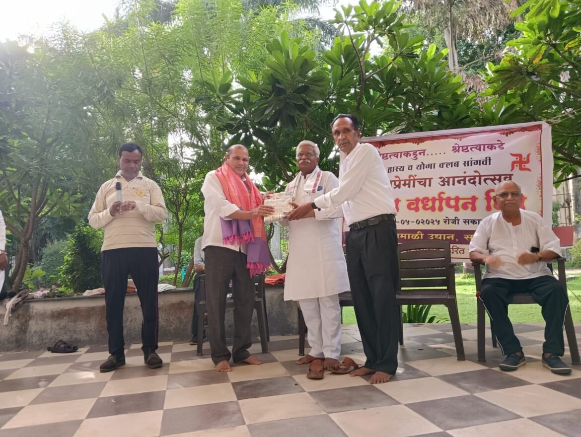 श्री बबनराव सोनवणे यांनीही याप्रसंगी आपले मनोगत व्यक्त केले. कार्यक्रमाचे सूत्रसंचालन श्री भाऊसाहेब जाधव आणि श्री सोनवणे यांनी संयुक्तपणे केले. या आनंददायी सोहळ्याला हास्य व योगा प्रेमी बंधू-भगिनींनी मोठ्या संख्येने उपस्थिती दर्शविली.